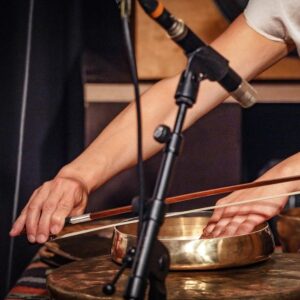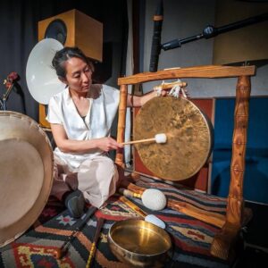 Bo-Sung Kim spielt auf der doppelseitigen Sanduhrtrommel Janggo und den Gongs Jing und Kkwaenggwari mit einem Verständnis von Puls, das aus der koreanischen Gugak-Musik stammt. Ihre aus traditionellen Kontexten stammenden Spieltechniken wendet sie in geräuschhaften Aktionen auf Holz, Fell und Metall teils wie eine Cage-interpretierende Klangforscherin ein. Dann wieder erschafft sie für SongOfMu ein rhytmisches Fundament, das in seiner energetischen Reduktion eher an Jackie Liebezeits Wirken für CAN erinnert, als an traditionelle Jazz- oder Freejazz-Kontexte.